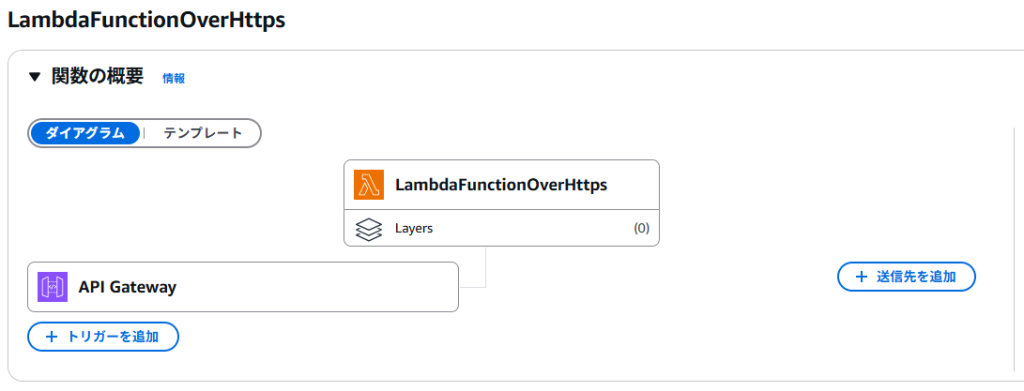 Lambda関数のトリガーとしてAPI Gatewayが設定された。