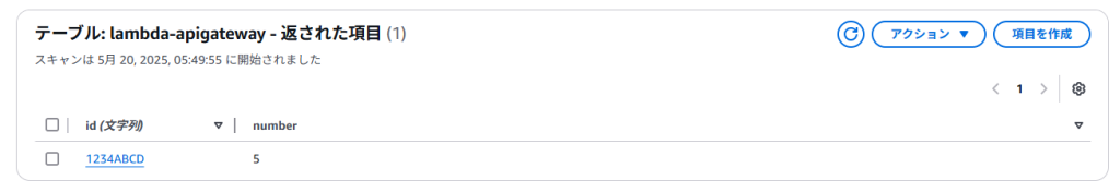 アイテムの探索から、[id] 1234ABCD と [number] 5 が付いた項目が作成されていることを確認。