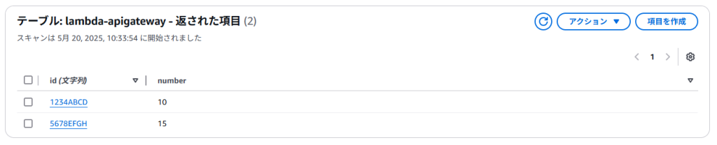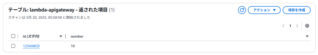 curl.exe 'https://XXXXXXXXXX.execute-api.ap-northeast-1.amazonaws.com/test/DynamoDBManager' -H 'Content-Type: application/json' -d '{\"operation\": \"create\", \"payload\": {\"Item\": {\"id\": \"5678EFGH\", \"number\": 15}}}'